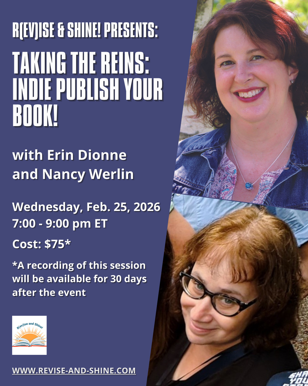 About the only obstacle still standing in the way of most writers interested in self-publishing their books is a lack of knowledge on where and how to begin. And that’s why we at R(ev)ise and Shine! are so excited to be hosting authors Erin Dionne and Nancy Werlin this Wednesday, February 25th for Taking the Reins: Indie Publish Your Book!, a two-hour online Zoomie that will walk attendees step-by-step through the process of publishing a manuscript as an indie author.